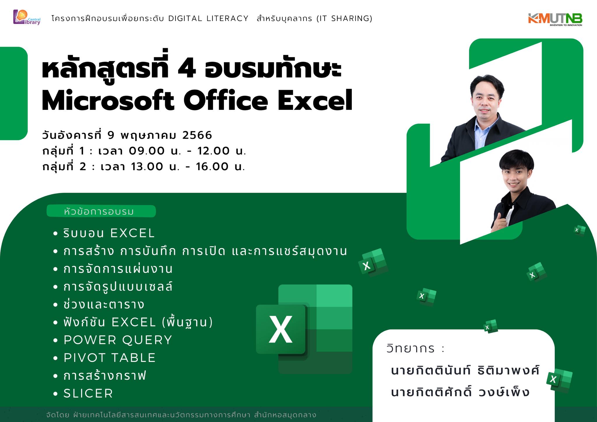 รองศาสตราจารย์ ดร.พยุง มีสัจ ผู้อำนวยการสำนักหอสมุดกลาง พร้อมด้วยตัวแทนบุคลากรสำนักหอสมุดกลาง เข้าร่วมโครงการฝึกอบรมเพื่อยกระดับ Digital Literacy สำหรับบุคลากร (IT Sharing) หลักสูตรที่ 4 อบรมทักษะ Microsoft Office Excel ณ ห้องอบรมคอมพิวเตอร์ ชั้น 8 สำนักหอสมุดกลาง มจพ. และในรูปแบบ Online เมื่อวันอังคารที่ 9 พฤษภาคม 2566 เวลา 08.30-16.00 น. โดย คุณกิตตินันท์ ธิติมาพงศ์ นักวิชาการคอมพิวเตอร์ชำนาญการ, คุณกิตติศักดิ์ วงษ์เพ็ง นักวิชาการคอมพิวเตอร์ วิทยากร, คุณยุทธชัย สมมุติ นักวิชาการคอมพิวเตอร์ และคุณแสงเดือน บำรุงภูมิ นักวิชาการศึกษา ฝ่ายเทคโนโลยีสารสนเทศและนวัตกรรมทางการศึกษา ผู้ช่วยวิทยากร