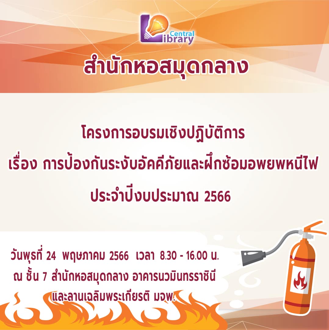 รองศาสตราจารย์ ดร.พยุง มีสัจ ผู้อำนวยการสำนักหอสมุดกลาง ผู้ช่วยศาสตราจารย์ ดร.วาทินี นุ้ยเพียร รองผู้อำนวยการฝ่ายบริหารและกิจการพิเศษ อาจารย์ ดร.รสจรินทร์ รัตนสุนทร รองผู้อำนวยการฝ่ายนวัตกรรมดิจิทัลและทรัพยากรสารสนเทศ รองศาสตราจารย์ ดร.ฉัตรชาญ ทองจับ ผู้อำนวยการสำนักพัฒนาเทคนิคศึกษา ที่ปรึกษาคณะกรรมการจัดการพลังงานและสิ่งแวดล้อม พร้อมด้วยบุคลากร กทม. วิทยาเขตระยอง วิทยาเขตปราจีนบุรี แม่บ้านสำนักหอสมุดกลาง รปภ. และบุคลากรจากหน่วยงานต่าง ๆ เข้าร่วมโครงการอบรมเชิงปฏิบัติการ เรื่อง การป้องกันระงับอัคคีภัยและฝึกซ้อมอพยพหนีไฟ ประจำปีงบประมาณ 2566 ภายใต้คณะกรรมการควบคุมภายในและการบริหารความเสี่ยง สำนักหอสมุดกลาง เมื่อวันพุธที่ 24 พฤษภาคม 2566 เวลา 08.30-16.00 น. โดยได้รับเกียรติจากวิทยากร คุณฉลอง บ่มทองหลาง พนักงานป้องกันและบรรเทาสาธารณภัยอาวุโส สถานีดับเพลิงและกู้ภัยบางโพ และคณะ โดยมีการอบรมความรู้ภาคทฤษฎี และภาคปฏิบัติ ณ ห้องโสตทัศนศึกษา ชั้น 7 และในรูปแบบ Online พร้อมฝึกซ้อมดับเพลิง ฝึกซ้อมอพยพหนีไฟ และจำลองสถานการณ์ ณ ลานเฉลิมพระเกียรติ มจพ.