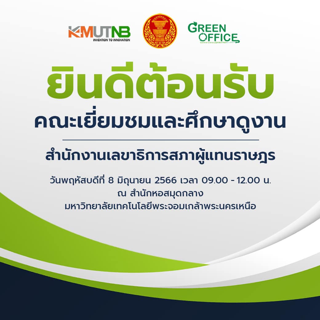 ผู้ช่วยศาสตราจารย์ ดร.ณัฐพงศ์ มกระธัช ผู้ช่วยอธิการบดีฝ่ายพัฒนาสิ่งแวดล้อมและกายภาพ รองศาสตราจารย์ ดร.พยุง มีสัจ ผู้อำนวยการสำนักหอสมุดกลาง ผู้ช่วยศาสตราจารย์ ดร.วาทินี นุ้ยเพียร รองผู้อำนวยการฝ่ายบริหารและกิจการพิเศษ อาจารย์ ดร.รสจรินทร์ รัตนสุนทร รองผู้อำนวยการฝ่ายนวัตกรรมดิจิทัลและทรัพยากรสารสนเทศ รองศาสตราจารย์ ดร.ฉัตรชาญ ทองจับ ผู้อำนวยการสำนักพัฒนาเทคนิคศึกษา ที่ปรึกษาคณะกรรมการจัดการพลังงานและสิ่งแวดล้อม พร้อมด้วยบุคลากรสำนักหอสมุดกลาง ให้การต้อนรับคณะเยี่ยมชมจากสำนักงานเลขาธิการสภาผู้แทนราษฎร นำโดย นายมาณิช อินทฉิม ผู้อำนวยการสำนักวิชาการ เมื่อวันพฤหัสบดีที่ 8 มิถุนายน 2566 เวลา 09.00-12.00 น. ในโอกาสเข้าเยี่ยมชมและศึกษาดูงาน เรื่อง สำนักงานสีเขียวที่เป็นมิตรกับสิ่งแวดล้อม (Green Office) พร้อมนำเสนองานด้านเทคโนโลยีสารสนเทศ นวัตกรรม และบริการของสำนักหอสมุดกลาง ทั้งยังได้เยี่ยมชมหอเกียรติประวัติ มหาวิทยาลัยเทคโนโลยีพระจอมเกล้าพระนครเหนือ
