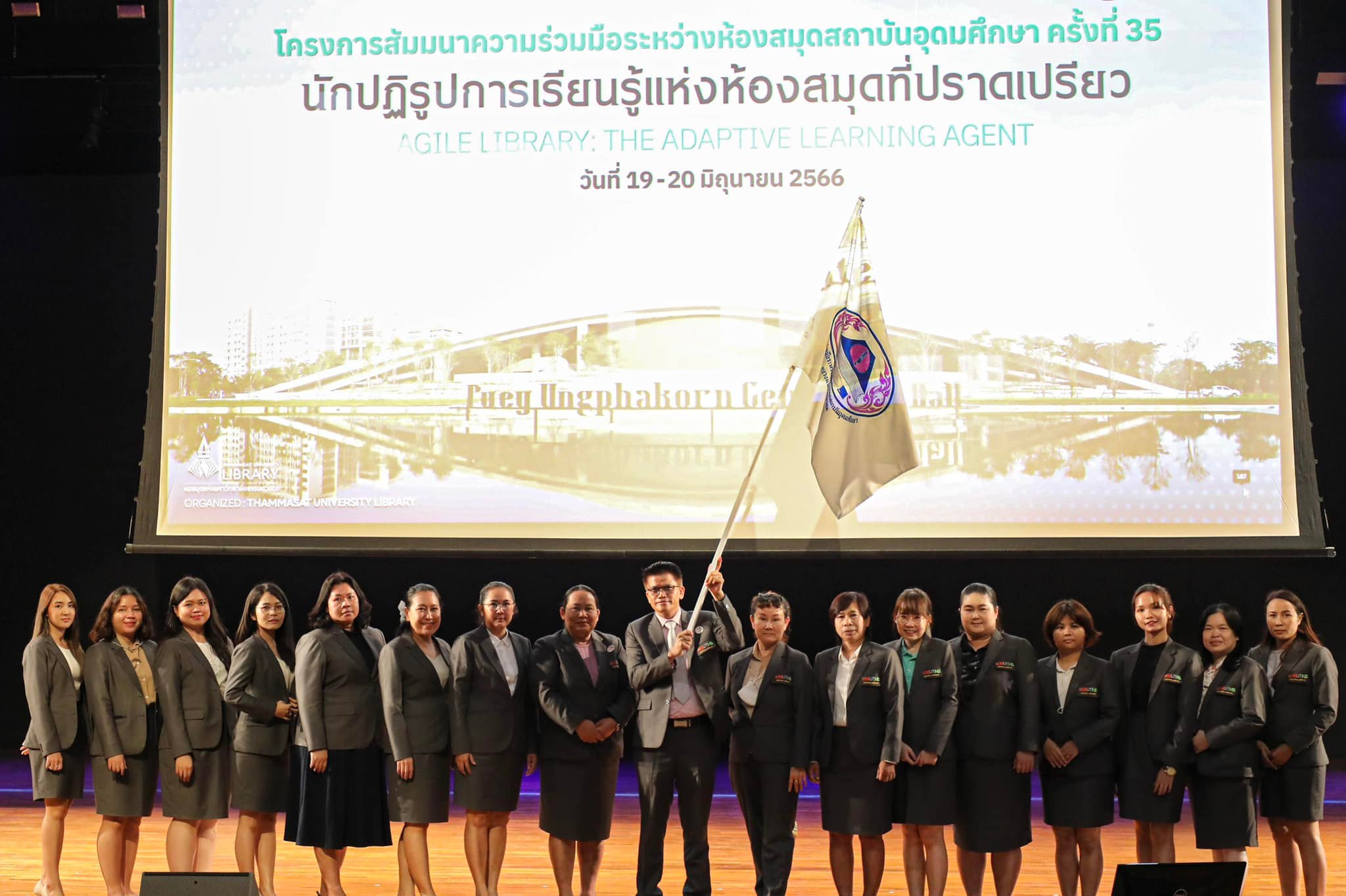 รองศาสตราจารย์ ดร.พยุง มีสัจ ผู้อำนวยการสำนักหอสมุดกลาง ผู้ช่วยศาสตราจารย์ ดร.วาทินี นุ้ยเพียร รองผู้อำนวยการฝ่ายบริหารและกิจการพิเศษ อาจารย์ ดร.รสจรินทร์ รัตนสุนทร รองผู้อำนวยการฝ่ายนวัตกรรมดิจิทัลและทรัพยากรสารสนเทศ พร้อมด้วยตัวแทนบุคลากรสำนักหอสมุดกลาง เข้าร่วมงานสัมมนาความร่วมมือระหว่างห้องสมุดสถาบันอุดมศึกษา ครั้งที่ 35 หัวข้อ “นักปฏิรูปการเรียนรู้แห่งห้องสมุดที่ปราดเปรียว” (Agile library : the adaptive learning agent) ซึ่งจัดโดยสำนักงานปลัดกระทรวงการอุดมศึกษา วิทยาศาสตร์ วิจัยและนวัตกรรม ร่วมกับหอสมุดแห่งมหาวิทยาลัยธรรมศาสตร์ ณ ห้องคอนเสิร์ตฮอล อาคารอุทยานเรียนรู้ ป๋วย 100 ปี มหาวิทยาลัยธรรมศาสตร์ ศูนย์รังสิต จังหวัดปทุมธานี ระหว่างวันที่ 19-20 มิถุนายน 2566