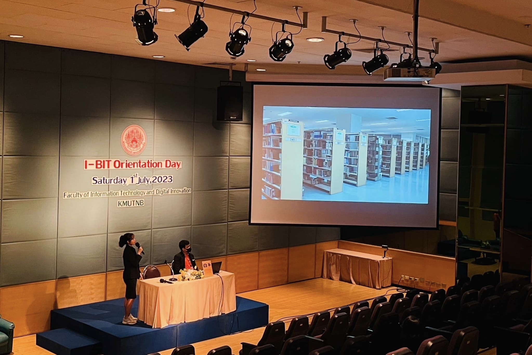 สำนักหอสมุดกลาง มจพ. ร่วมบรรยาย เรื่อง การใช้บริการต่าง ๆ ของสำนักหอสมุดกลาง (ภาคภาษาอังกฤษ) ในโครงการปฐมนิเทศนักศึกษาระดับปริญญาบัณฑิต เพื่อส่งเสริมคุณธรรม จริยธรรม และกิจกรรมสานสัมพันธ์ ประจำปีการศึกษา 2566 คณะเทคโนโลยีสารสนเทศและนวัตกรรมดิจิทัล พร้อมแนะนำเว็บไซต์ วิธีการเข้าถึงทรัพยากรสารสนเทศ นวัตกรรม และบริการต่าง ๆ ของสำนักหอสมุดกลาง โดยคุณณัฐนันท์ บัวเอี่ยม บรรณารักษ์ ฝ่ายบริการสารสนเทศ ณ หอประชุมเบญจรัตน์ เมื่อวันเสาร์ที่ 1 กรกฎาคม 2566 เวลา 09.30-10.00 น.