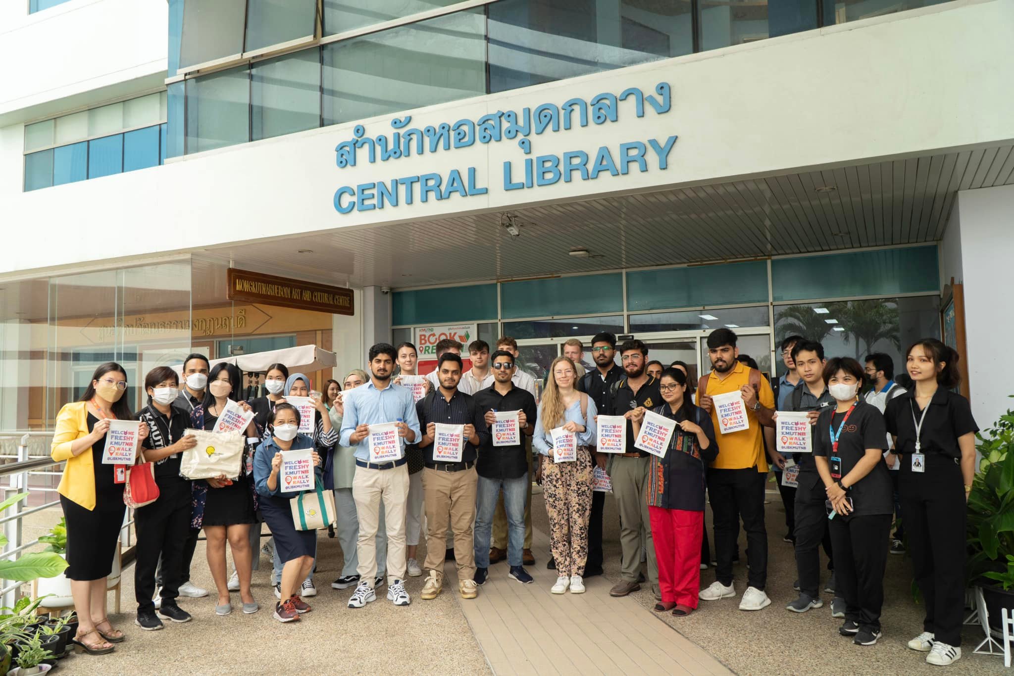 สำนักหอสมุดกลาง มจพ. จัดโครงการ Walk Rally @LIBKMUTNB แก่นักศึกษาใหม่ ประจำปีการศึกษา 2566 ระดับบัณฑิตศึกษา และนักศึกษาแลกเปลี่ยน จากบัณฑิตวิทยาลัยวิศวกรรมศาสตร์นานาชาติสิรินธร ไทย - เยอรมัน (TGGS) นำทีมต้อนรับโดย รองศาสตราจารย์ ดร.พยุง มีสัจ ผู้อำนวยการสำนักหอสมุดกลาง พร้อมด้วยตัวแทนบุคลากรสำนักหอสมุดกลาง เมื่อวันพุธที่ 9 สิงหาคม 2566 เวลา 11.00-12.00 น. ในโอกาสนี้ ได้เดินชมบรรยากาศ แนะนำเว็บไซต์ วิธีการเข้าถึงทรัพยากรสารสนเทศ นวัตกรรม และบริการต่าง ๆ พร้อมรับของที่ระลึกสุดพิเศษจากสำนักหอสมุดกลาง