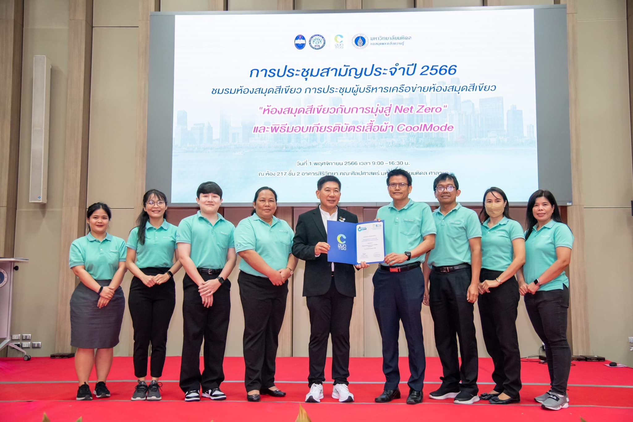 รองศาสตราจารย์ ดร.พยุง มีสัจ ผู้อำนวยการสำนักหอสมุดกลาง ผู้ช่วยศาสตราจารย์ ดร.วาทินี นุ้ยเพียร รองผู้อำนวยการฝ่ายบริหารและกิจการพิเศษ พร้อมด้วยตัวแทนบุคลากรสำนักหอสมุดกลาง เข้าร่วมการประชุมสามัญประจำปี 2566 ชมรมห้องสมุดสีเขียว และการประชุมผู้บริหารเครือข่ายห้องสมุดสีเขียว “ห้องสมุดสีเขียวกับการมุ่งสู่ Net Zero” จัดโดยหอสมุดและคลังความรู้ มหาวิทยาลัยมหิดล ร่วมกับองค์การบริหารจัดการก๊าซเรือนกระจก (องค์การมหาชน) และชมรมห้องสมุดสีเขียว สมาคมห้องสมุดแห่งประเทศไทยฯ ณ อาคารสิริวิทยา คณะศิลปศาสตร์ มหาวิทยาลัยมหิดล ศาลายา และศึกษาดูงาน อุทยานธรรมชาติวิทยาสิรีรุกขชาติ เมื่อวันพุธที่ 1 พฤศจิกายน 2566 เวลา 09.00-16.30 น. ในโอกาสนี้ สำนักหอสมุดกลางมหาวิทยาลัยเทคโนโลยีพระจอมเกล้าพระนครเหนือ ได้รับมอบเกียรติบัตร องค์กรลดโลกร้อน ด้วยเสื้อผ้า CoolMode โดยได้รับเกียรติจาก คุณเกียรติชาย ไมตรีวงษ์ ผู้อำนวยการองค์การบริหารจัดการก๊าซเรือนกระจก (องค์การมหาชน) เป็นผู้มอบรางวัล