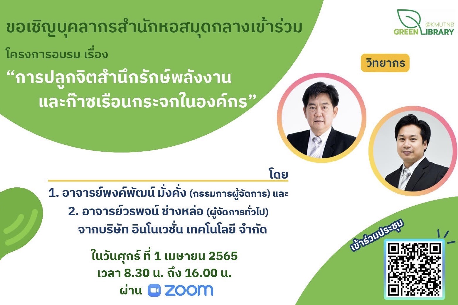 รองศาสตราจารย์ ดร.พยุง มีสัจ ผู้อำนวยการสำนักหอสมุดกลาง ผู้ช่วยศาสตราจารย์ ดร.วาทินี นุ้ยเพียร รองผู้อำนวยการฝ่ายบริหารและกิจการพิเศษ พร้อมด้วยบุคลากรสำนักหอสมุดกลาง เข้าร่วมโครงการอบรม เรื่อง “การปลูกจิตสำนึกรักษ์พลังงานและก๊าซเรือนกระจกในองค์กร” ภายใต้คณะกรรมการจัดการพลังงานและสิ่งแวดล้อม ในรูปแบบ Online เมื่อวันศุกร์ที่ 1 เมษายน 2565 เวลา 08.30-16.00 น. โดยได้รับเกียรติจากวิทยากร อาจารย์พงค์พัฒน์ มั่งคั่ง กรรมการผู้จัดการ บริษัท อินโนเวชั่น เทคโนโลยี จำกัด และอาจารย์วรพจน์ ช่างหล่อ ผู้จัดการทั่วไป
