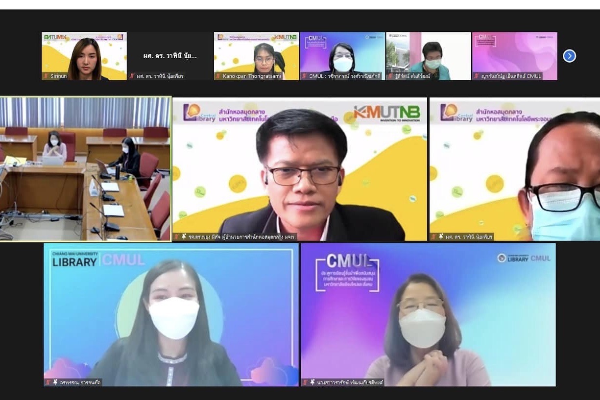 รองศาสตราจารย์ ดร.พยุง มีสัจ ผู้อำนวยการสำนักหอสมุดกลาง ผู้ช่วยศาสตราจารย์ ดร.วาทินี นุ้ยเพียร รองผู้อำนวยการฝ่ายบริหารและกิจการพิเศษ อาจารย์ ดร.รสจรินทร์ รัตนสุนทร รองผู้อำนวยการฝ่ายนวัตกรรมดิจิทัลและทรัพยากรสารสนเทศ พร้อมด้วยบุคลากรสำนักหอสมุดกลาง เข้าศึกษาดูงานสำนักหอสมุด มหาวิทยาลัยเชียงใหม่ เกี่ยวกับการดำเนินงานด้าน Green Library, EdPEx ทั้งยังแลกเปลี่ยนเรียนรู้ด้านนวัตกรรมบริการ ในรูปแบบออนไลน์ เมื่อวันอังคารที่ 20 กันยายน 2565 เวลา 09.00-12.00 น. โดยได้รับเกียรติจากคณะผู้บริหารสำนักหอสมุด มหาวิทยาลัยเชียงใหม่ คุณวรารักษ์ พัฒนเกียรติพงศ์ รักษาการแทนผู้อำนวยการสำนักหอสมุด, คุณอรพรรณ การคนซื่อ รักษาการแทนรองผู้อำนวยการ, คุณปราชญ์ สงวนศักดิ์ รักษาการแทนรองผู้อำนวยการ และคุณวชิราภรณ์ วงศ์วาณิชภักดิ์ เลขานุการ