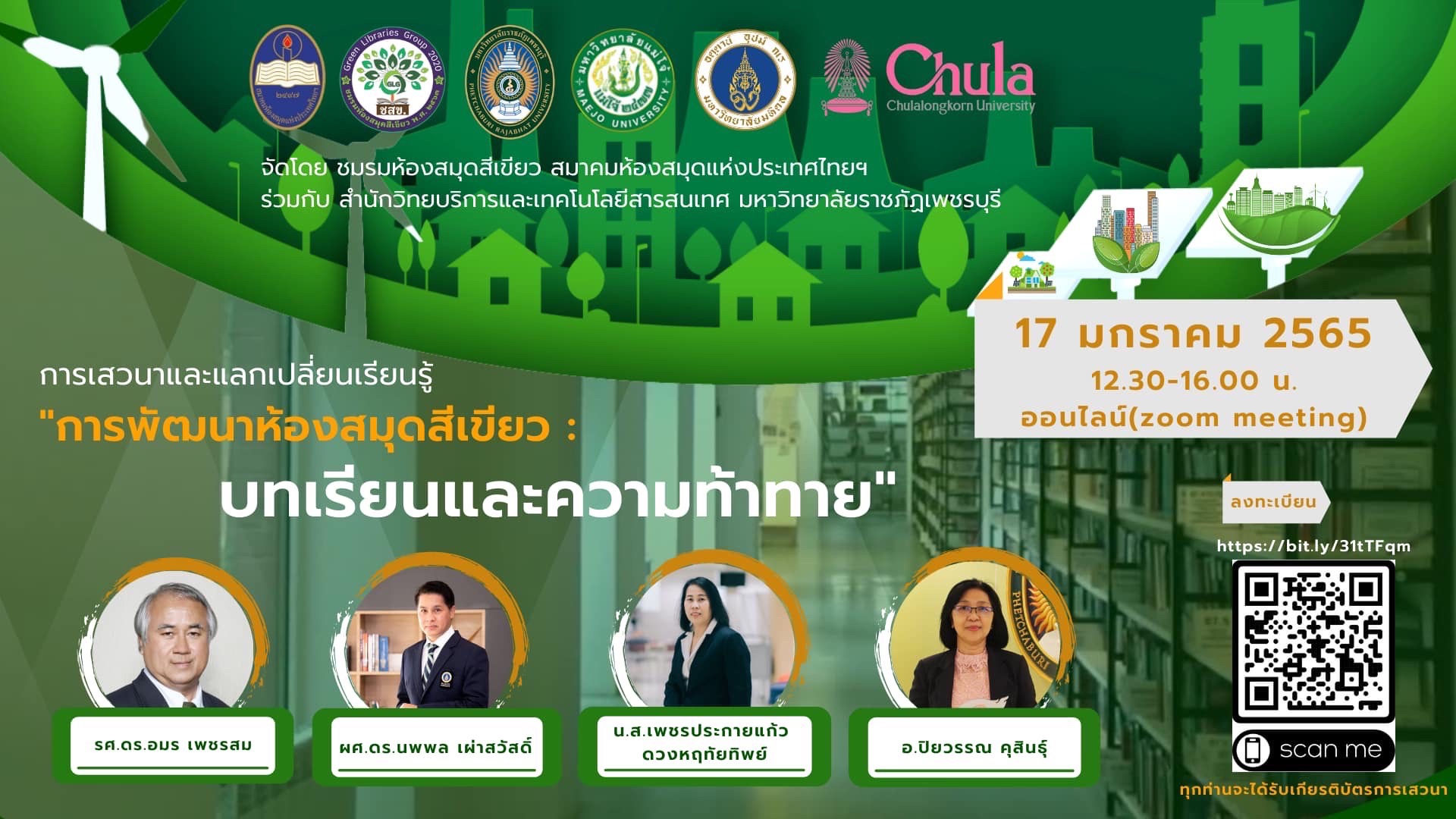 ตัวแทนบุคลากรสำนักหอสมุดกลาง เข้าร่วมงานเสวนาและแลกเปลี่ยนเรียนรู้ เรื่อง “การพัฒนาห้องสมุดสีเขียว : บทเรียนและความท้าทาย” ภายใต้คณะกรรมการจัดการพลังงานและสิ่งแวดล้อม ซึ่งจัดโดยชมรมห้องสมุดสีเขียว สมาคมห้องสมุดแห่งประเทศไทย ร่วมกับสำนักวิทยบริการและเทคโนโลยีสารสนเทศ มหาวิทยาลัยราชภัฏเพชรบุรี ในรูปแบบ Online และถ่ายทอดสดผ่าน Facebook Page สำนักวิทยบริการและเทคโนโลยีสารสนเทศ มหาวิทยาลัยราชภัฏเพชรบุรี เมื่อวันจันทร์ที่ 17 มกราคม 2565 เวลา 13.00-16.00 น. โดยได้รับเกียรติจากวิทยากรจากห้องสมุด 4 แห่ง ที่ได้รับรองการตรวจประเมินห้องสมุดสีเขียว ประจำปี พ.ศ. 2564 ได้แก่ รองศาสตราจารย์ ดร.อมร เพชรสม ผู้อำนวยการสำนักงานวิทยทรัพยากร จุฬาลงกรณ์มหาวิทยาลัย ผู้ช่วยศาสตราจารย์ ดร.นพพล เผ่าสวัสดิ์ ผู้อำนวยการหอสมุดและคลังความรู้ มหาวิทยาลัยมหิดล นางสาวเพชรประกายแก้ว ดวงหฤทัยทิพย์ ผู้อำนวยการกองบริหารงาน สำนักหอสมุด มหาวิทยาลัยแม่โจ้ และนางปิยวรรณ คุสินธุ์ ผู้อำนวยการสำนักวิทยบริการและเทคโนโลยีสารสนเทศ มหาวิทยาลัยราชภัฏเพชรบุรี
