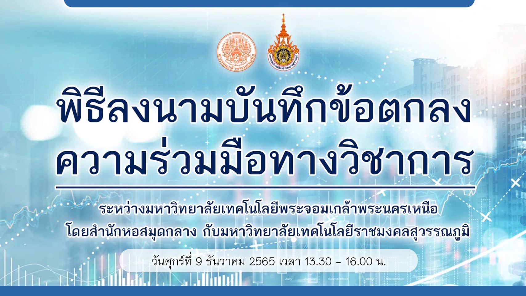 รองศาสตราจารย์ ดร.พยุง มีสัจ ผู้อำนวยการสำนักหอสมุดกลาง ผู้ช่วยศาสตราจารย์ ดร.วาทินี นุ้ยเพียร รองผู้อำนวยการฝ่ายบริหารและกิจการพิเศษ และอาจารย์ ดร.รสจรินทร์ รัตนสุนทร รองผู้อำนวยการฝ่ายนวัตกรรมดิจิทัลและทรัพยากรสารสนเทศ พร้อมด้วยตัวแทนบุคลากรสำนักหอสมุดกลาง ให้การต้อนรับคณะผู้บริหารและตัวแทนบุคลากร จากสำนักวิทยบริการและเทคโนโลยีสารสนเทศ มหาวิทยาลัยเทคโนโลยีราชมงคลสุวรรณภูมิ ในพิธีลงนามบันทึกข้อตกลงความร่วมมือทางวิชาการ ระหว่างมหาวิทยาลัยเทคโนโลยีพระจอมเกล้าพระนครเหนือ โดยสำนักหอสมุดกลาง กับมหาวิทยาลัยเทคโนโลยีราชมงคลสุวรรณภูมิ พร้อมนำเสนองานด้านเทคโนโลยีสารสนเทศ นวัตกรรม บริการ และวัฒนธรรมสีเขียวของสำนักหอสมุดกลาง ณ Smart Space @KMUTNB ชั้น 7 สำนักหอสมุดกลาง มจพ. เมื่อวันศุกร์ที่ 9 ธันวาคม 2565 เวลา 13.30-16.00 น.