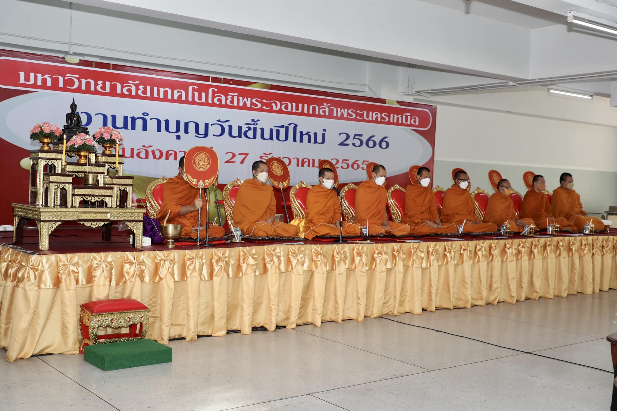 ศาสตราจารย์ ดร.สุชาติ เซี่ยงฉิน อธิการบดี คณะผู้บริหารมหาวิทยาลัยเทคโนโลยีพระจอมเกล้าพระนครเหนือ บุคลากร และรองศาสตราจารย์ ดร.พยุง มีสัจ ผู้อำนวยการสำนักหอสมุดกลาง ผู้ช่วยศาสตราจารย์ ดร.วาทินี นุ้ยเพียร รองผู้อำนวยการฝ่ายบริหารและกิจการพิเศษ อาจารย์ ดร.รสจรินทร์ รัตนสุนทร รองผู้อำนวยการฝ่ายนวัตกรรมดิจิทัลและทรัพยากรสารสนเทศ พร้อมด้วยตัวแทนบุคลากรสำนักหอสมุดกลาง เข้าร่วมงานทำบุญวันขึ้นปีใหม่ 2566 ณ อาคารอเนกประสงค์ มจพ. เมื่อวันอังคารที่ 27 ธันวาคม 2565 เวลา 08.00-09.00 น.
