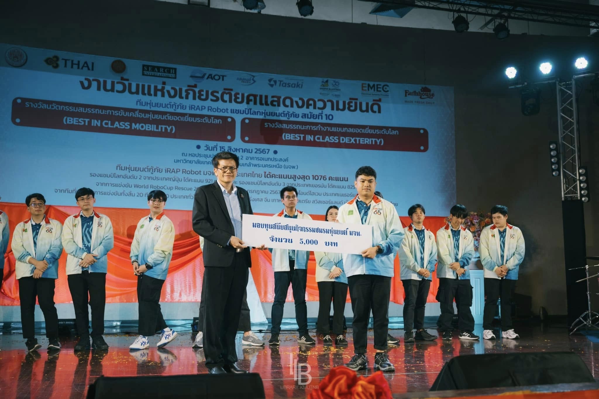 รองศาสตราจารย์ ดร.พยุง มีสัจ ผู้อำนวยการสำนักหอสมุดกลาง ร่วมแสดงความยินดีกับทีมหุ่นยนต์กู้ภัย iRAP Robot ในงานวันแห่งเกียรติยศทีมหุ่นยนต์กู้ภัย iRAP Robot ในโอกาสที่ได้รับรางวัลชนะเลิศแชมป์โลกหุ่นยนต์กู้ภัย World RoboCup Rescue 2024 รางวัล Best in class mobility (รางวัลนวัตกรรมสมรรถนะการขับเคลื่อนหุ่นยนต์ยอดเยี่ยมระดับโลก) และรางวัล Best in class dexterity (รางวัลสมรรถนะการทำงานแขนกลยอดเยี่ยมระดับโลก) ในโอกาสนี้ ได้ร่วมมอบทุนการศึกษา เพื่อแสดงความยินดี สนับสนุนกิจกรรมชมรมหุ่นยนต์ มจพ. และเป็นกำลังใจแก่นักศึกษาทีมหุ่นยนต์กู้ภัย iRAP Robot ที่ได้เป็นตัวแทนเข้าร่วมการแข่งขัน และสร้างชื่อเสียงให้แก่มหาวิทยาลัยและประเทศไทย ณ หอประชุมประดู่แดง ชั้น 2 อาคารอเนกประสงค์ มหาวิทยาลัยเทคโนโลยีพระจอมเกล้าพระนครเหนือ เมื่อวันพฤหัสบดีที่ 15 สิงหาคม 2567 เวลา 16.00-20.00 น.#SDG4 #SDG9 #SDG11 #SDG17
