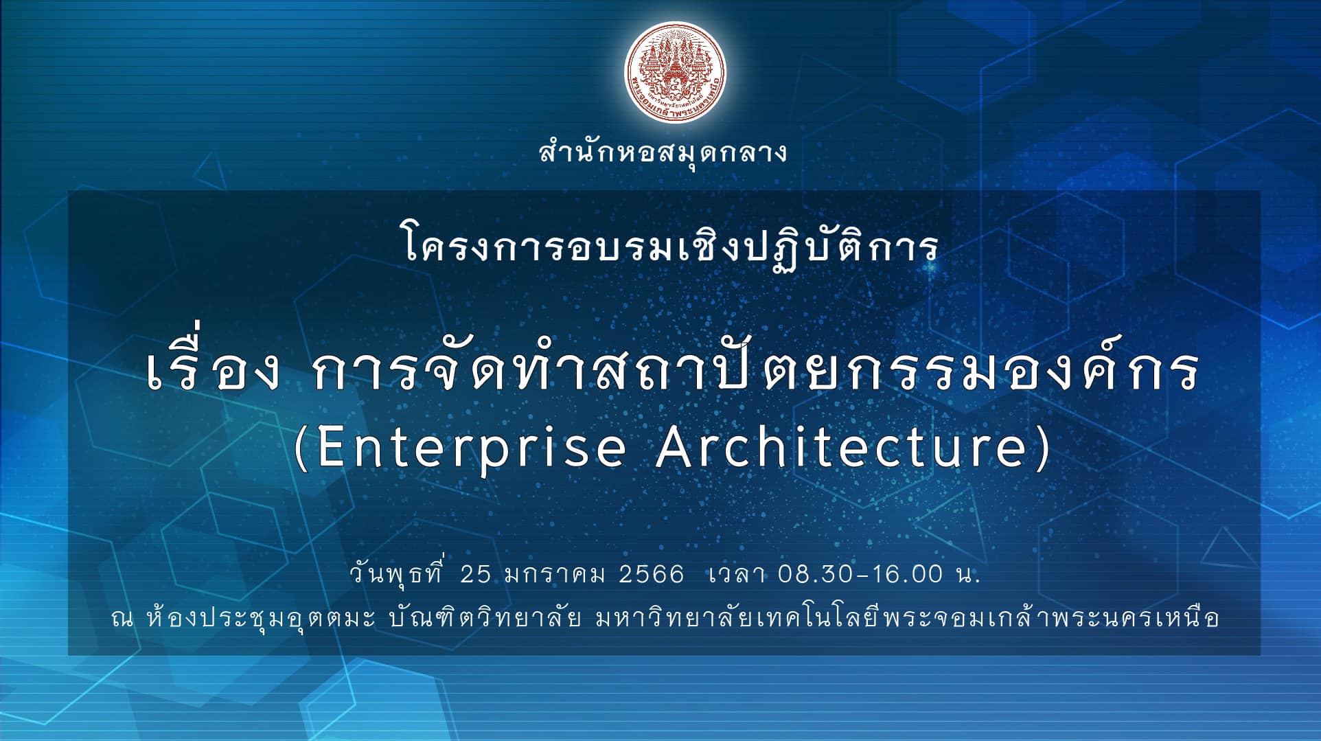 รองศาสตราจารย์ ดร.พยุง มีสัจ ผู้อำนวยการสำนักหอสมุดกลาง อาจารย์ ดร.รสจรินทร์ รัตนสุนทร รองผู้อำนวยการฝ่ายนวัตกรรมดิจิทัลและทรัพยากรสารสนเทศ พร้อมด้วยบุคลากรสำนักหอสมุดกลาง เข้าร่วมโครงการอบรมเชิงปฏิบัติการ เรื่อง การจัดทำสถาปัตยกรรมองค์กร (Enterprise Architecture) โดยบุคลากรได้ฟังการบรรยายและร่วมทำกิจกรรม Workshop เพื่อวิเคราะห์และออกแบบสถาปัตยกรรมองค์กร ณ ห้องอุตตมะ ชั้น 12 บัณฑิตวิทยาลัย มจพ. และในรูปแบบ Online เมื่อวันพุธที่ 25 มกราคม 2566 เวลา 08.30-16.00 น. โดยได้รับเกียรติจากวิทยากร ผู้ช่วยศาสตราจารย์ ดร.นวพร วิสิฐพงศ์พันธ์, ผู้ช่วยศาสตราจารย์ จีระศักดิ์ นำประดิษฐ์ อาจารย์ ภาควิชาการบริหารเครือข่ายดิจิทัลและความมั่นคงปลอดภัยสารสนเทศ และรองศาสตราจารย์ ดร.นลินภัสร์ บำเพ็ญเพียร อาจารย์ ภาควิชาเทคโนโลยีสารสนเทศ คณะเทคโนโลยีสารสนเทศและนวัตกรรมดิจิทัล